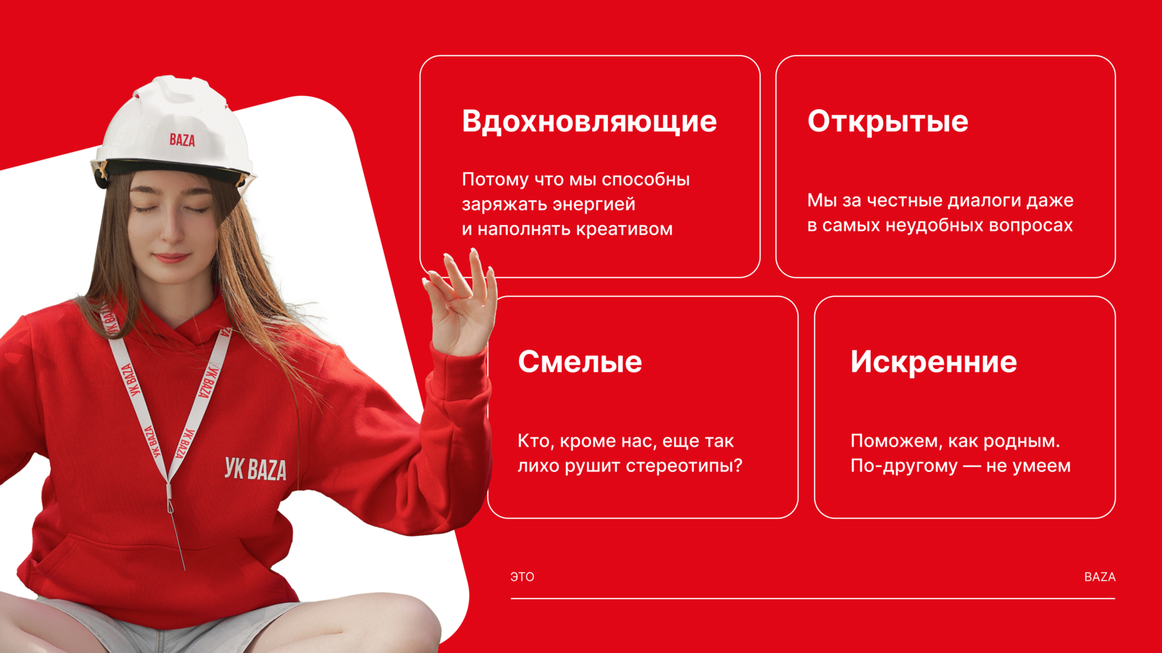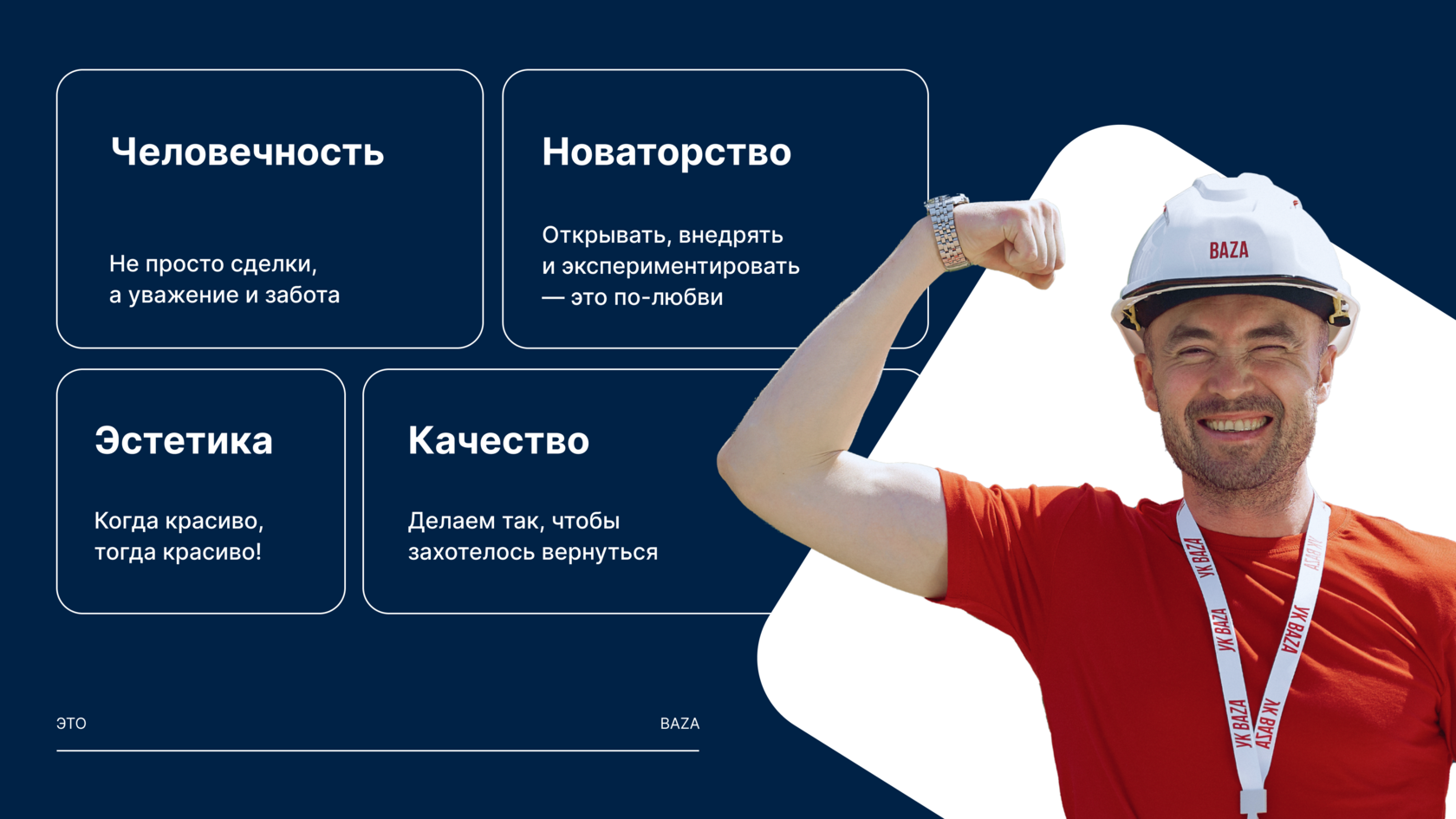 В строительстве есть понятие «несущие конструкции» — то, что держит весь дом. Наши ценности — это как раз такие опоры. Только для бизнеса. Это: