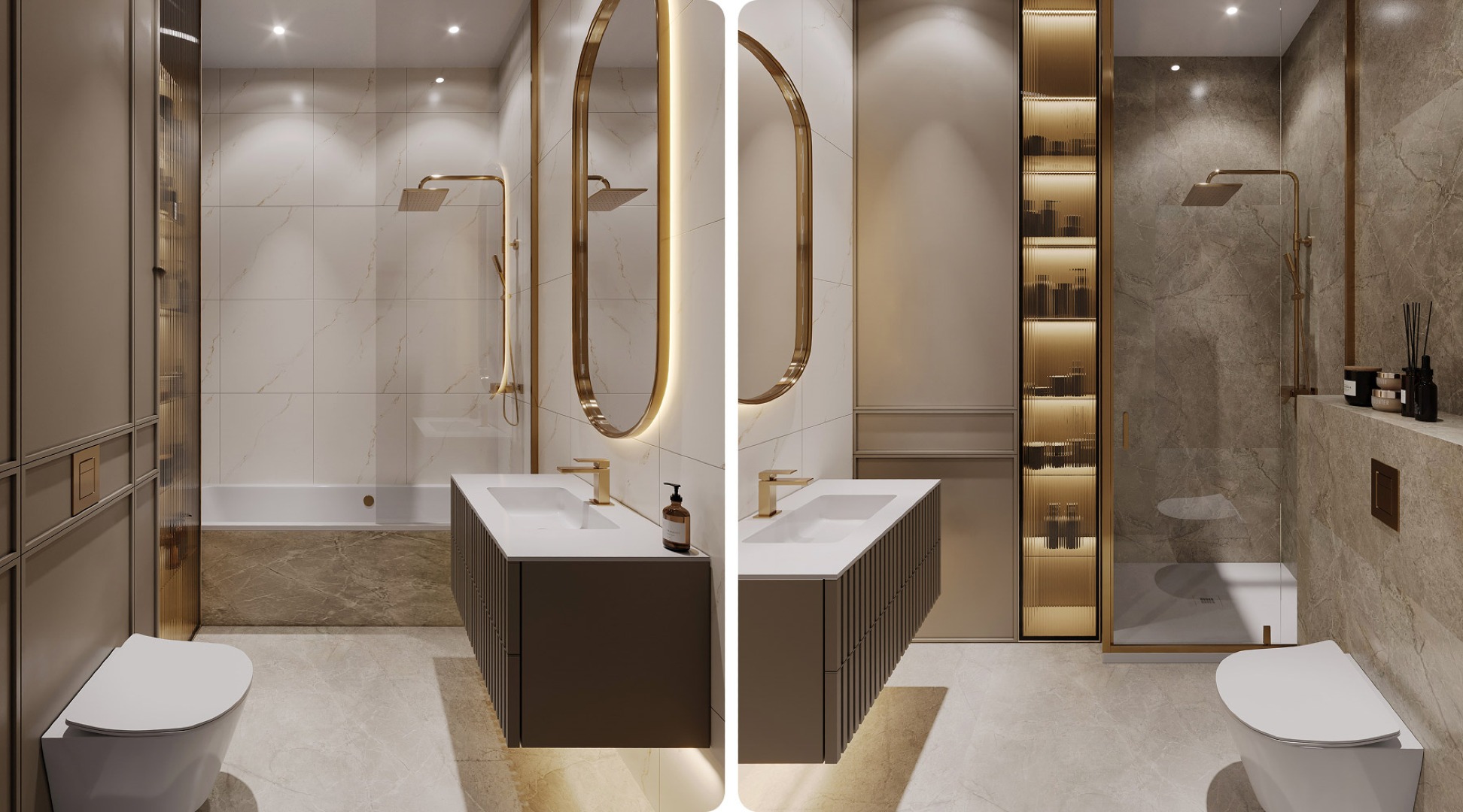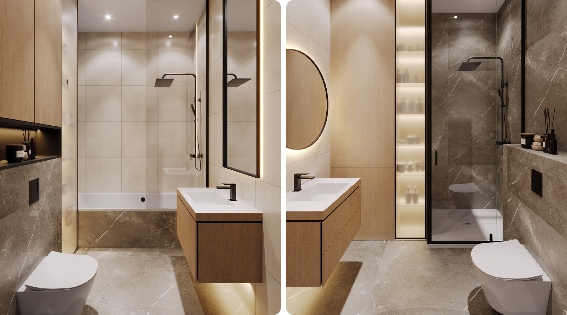 Основные элементы заключаются в строгих линиях и геометрических формах. Светло-серые оттенки создают ощущение простора и света. В санузлах стиль проявляется особенно — здесь светло-серая палитра дополняется строгими черными акцентами, подчеркивая лаконичность форм.