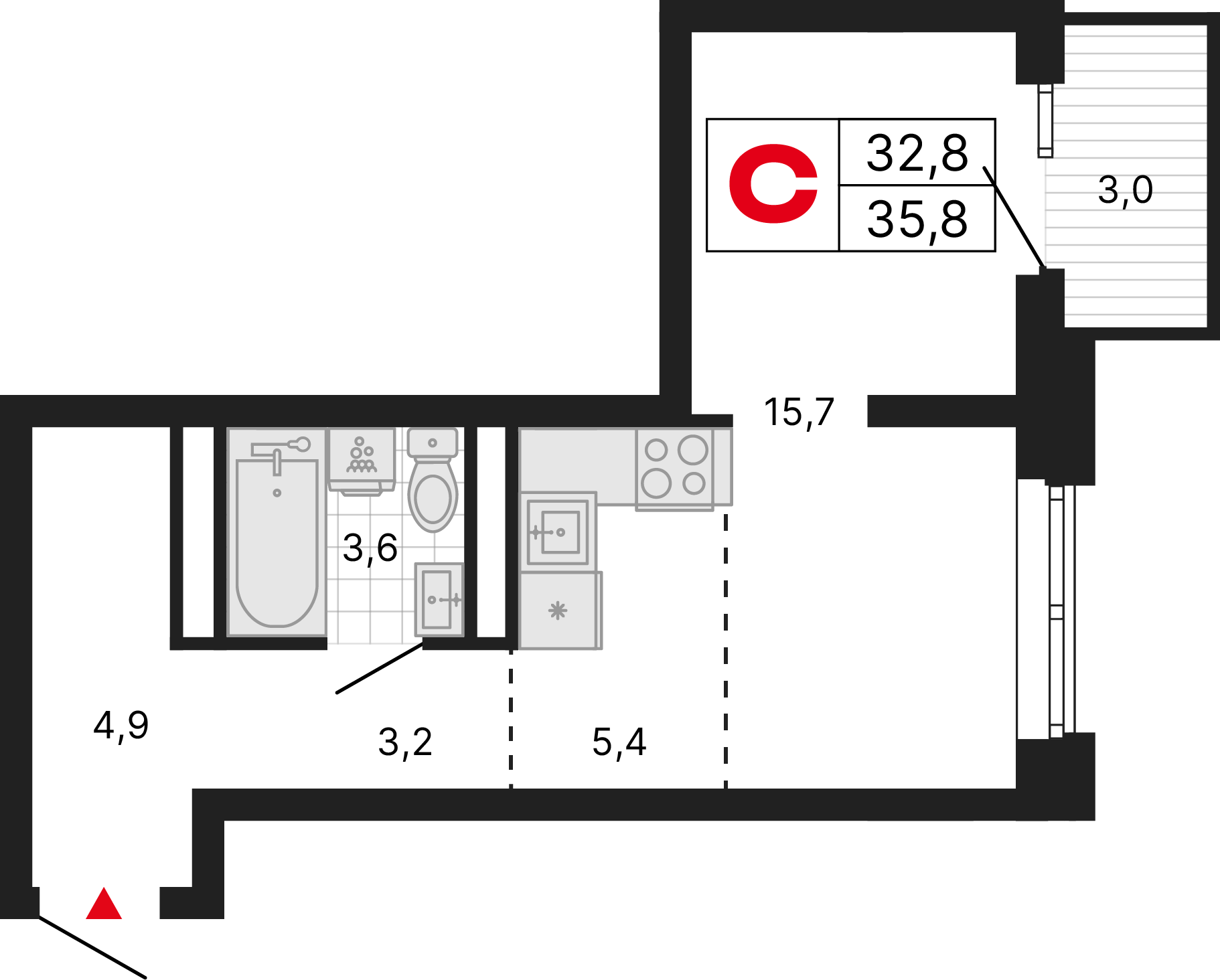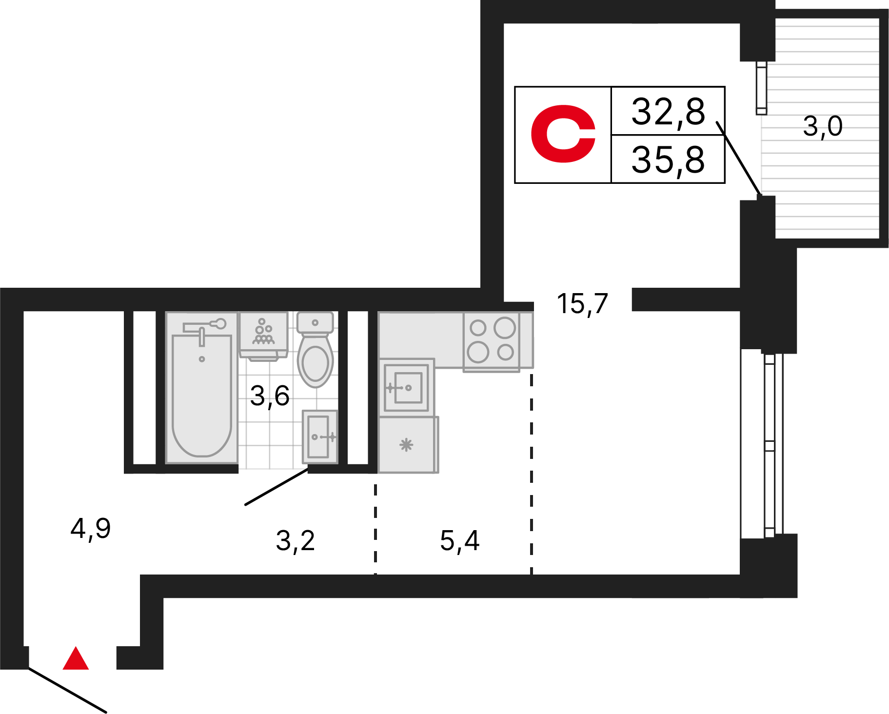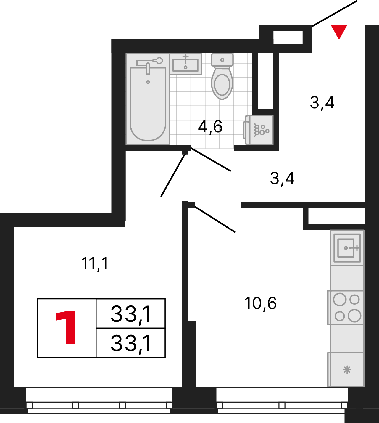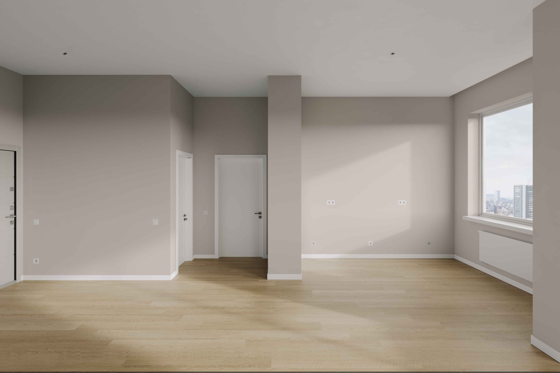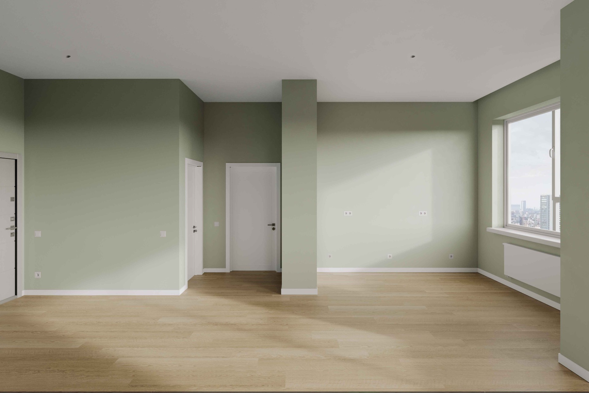 Полностью подготовленное основание для дальнейшей чистовой отделки: выровненные оштукатуренныестены, стяжка пола, разведенные инженерные коммуникации, установленные радиаторы отопления и один набор сантехники (унитаз и раковина).
