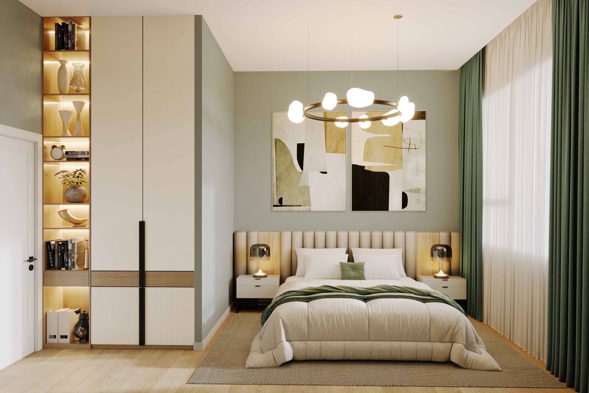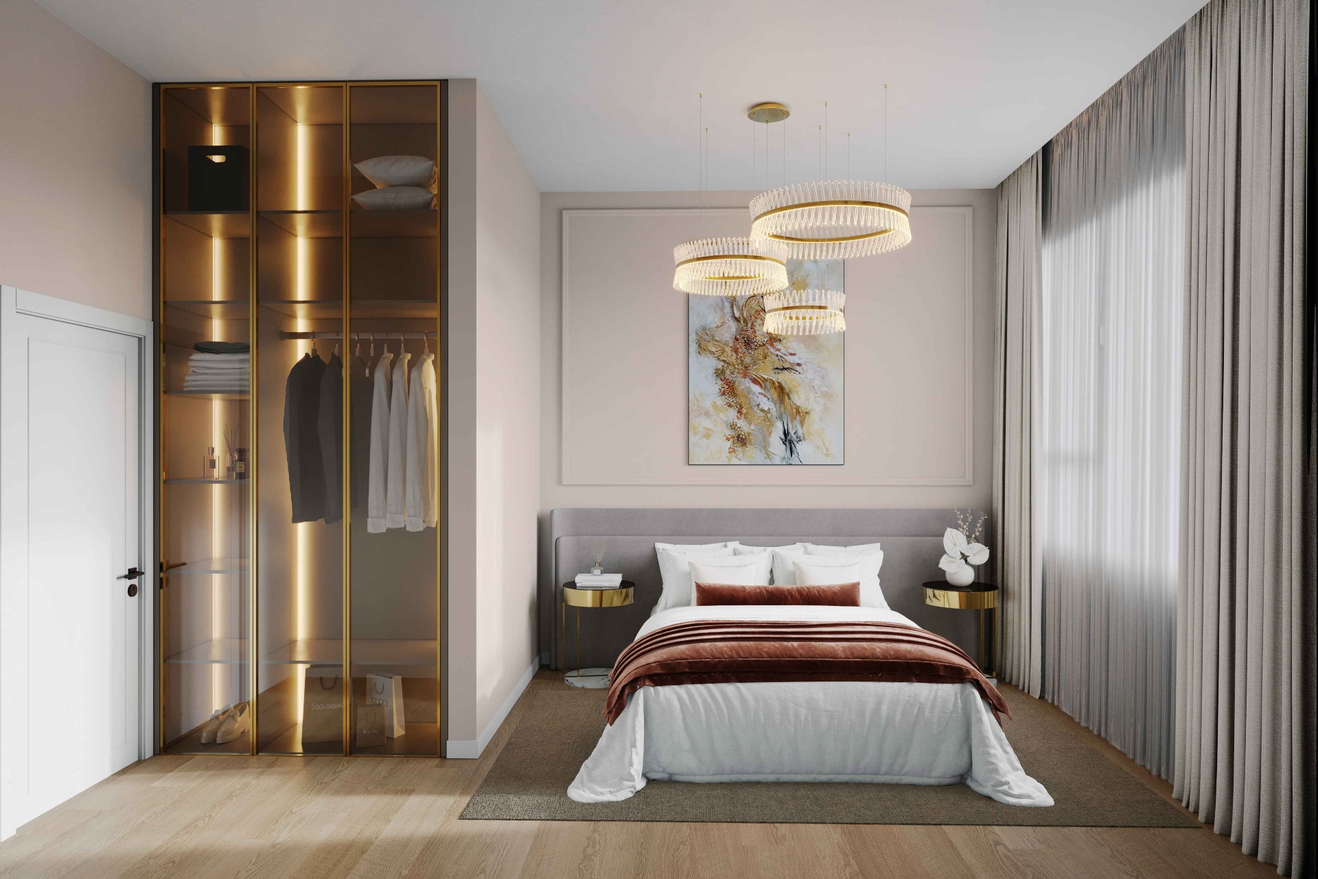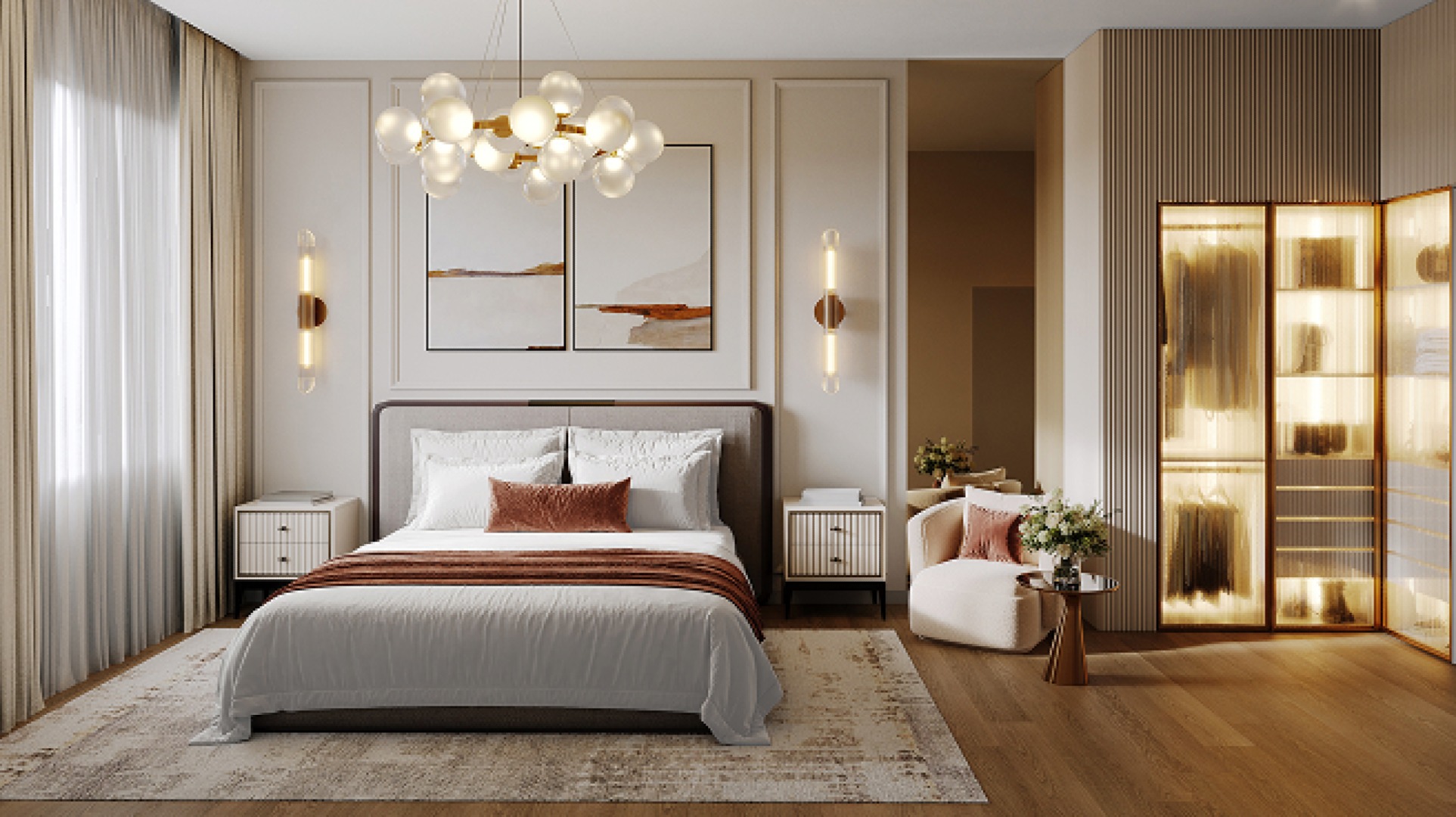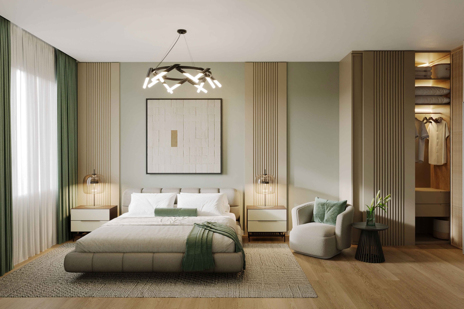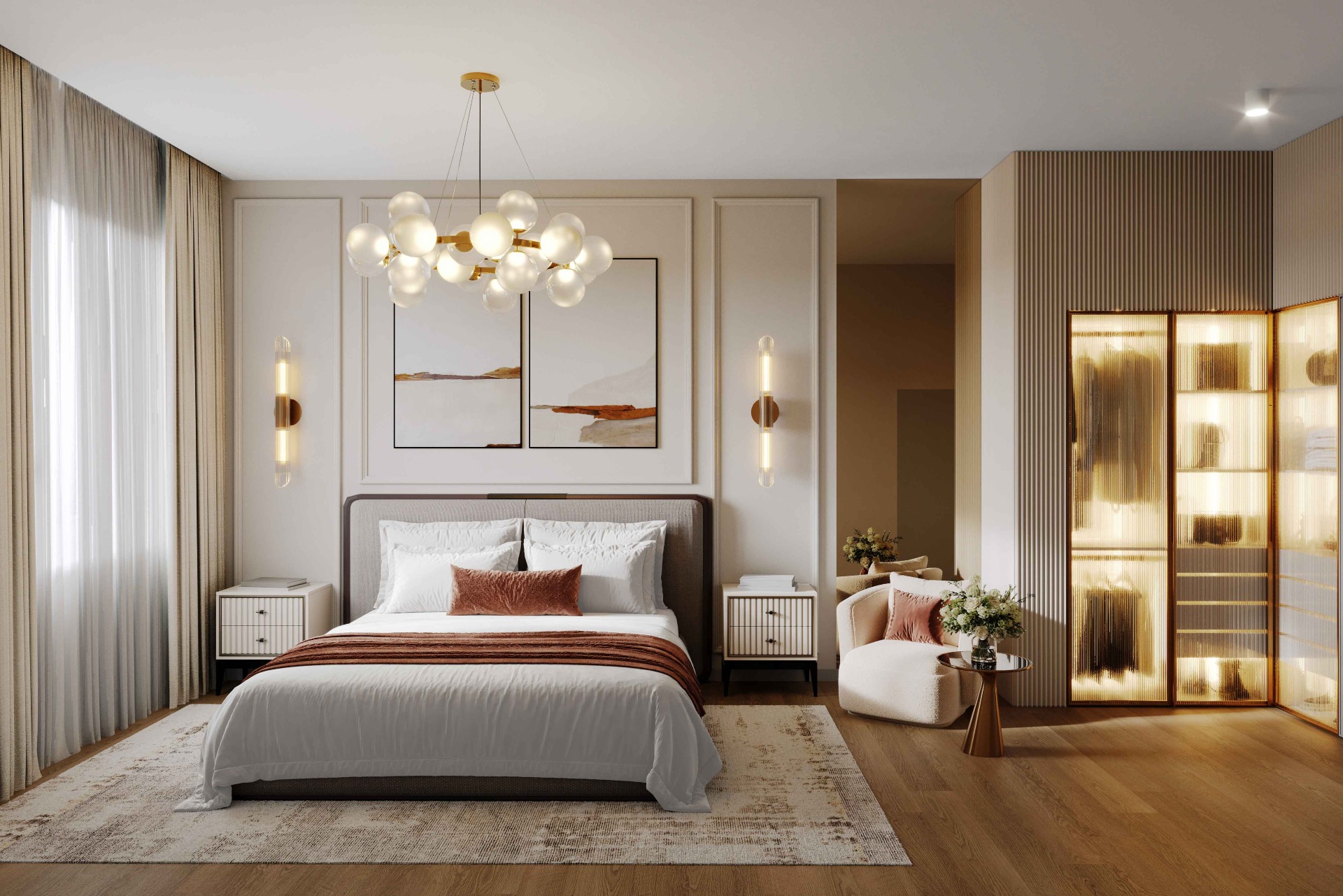 Место силы счастливчиков: уединённая спальня с отдельным санузлом и гардеробной. Спокойный отдых, даже если в гостиной кипит жизнь.