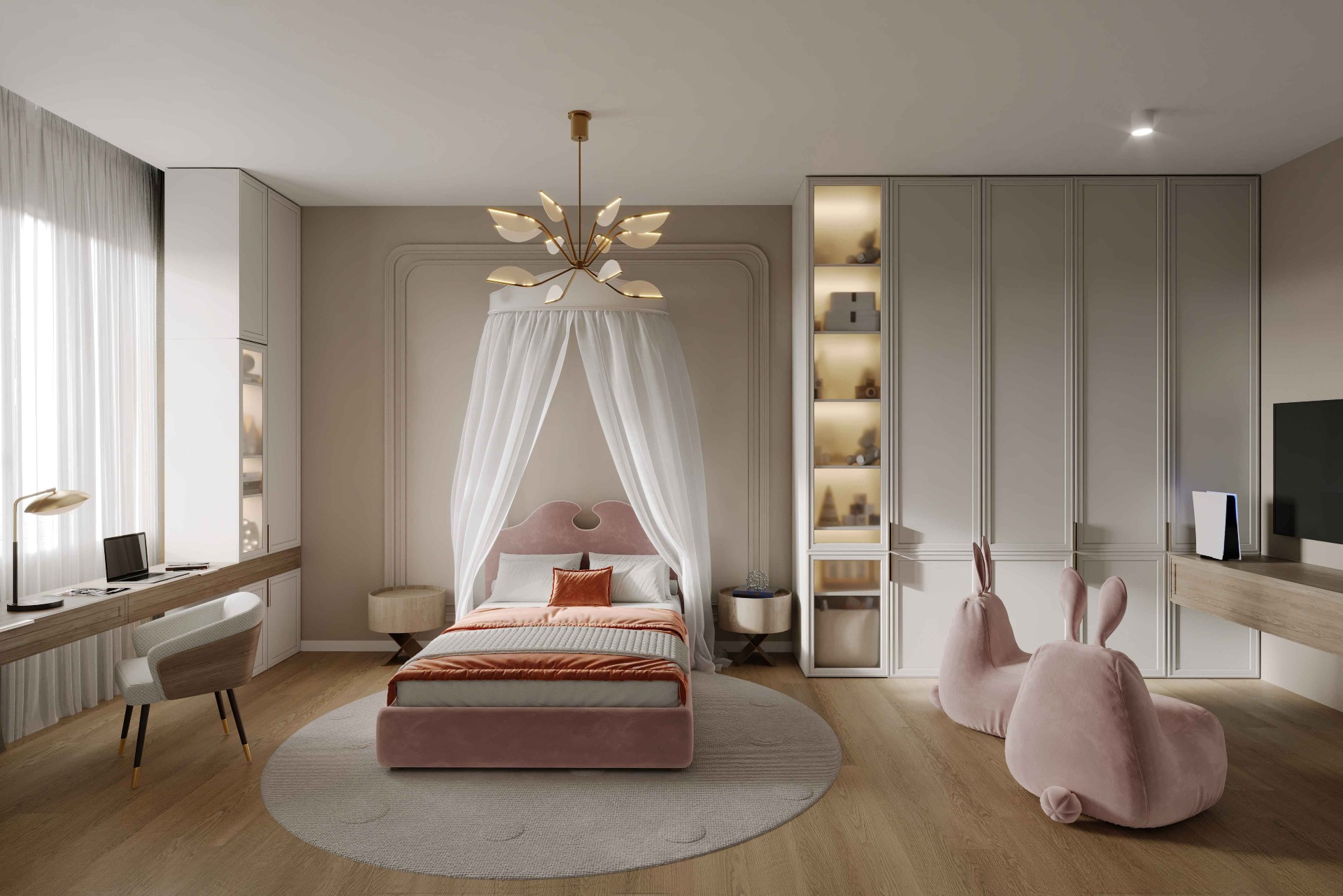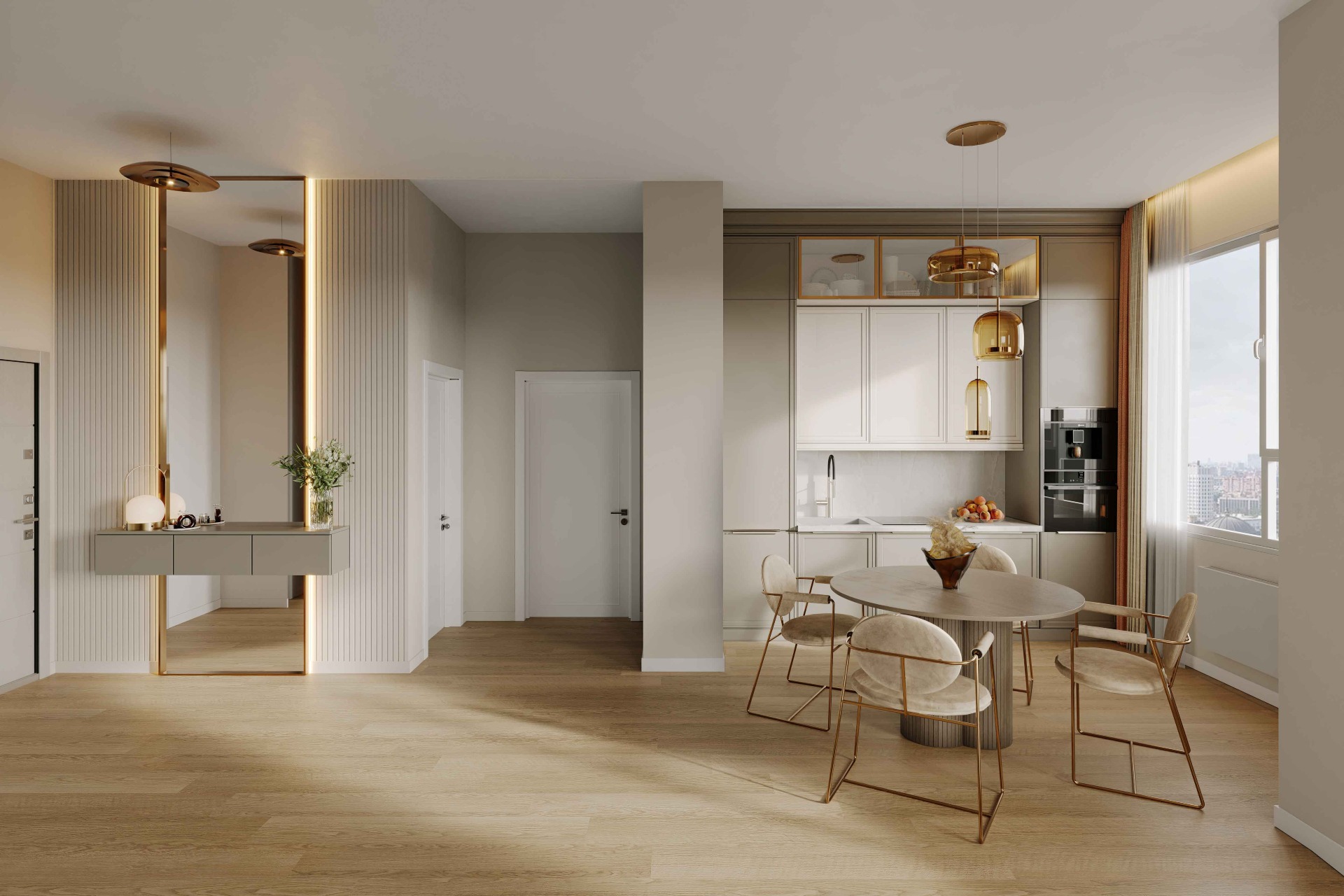 Основу цветовой палитры составляют светло-коричневые тона, которые создают ощущение тепла и спокойствия. Молдинги из полиуретана на стенах позволяют создать эффект объема и текстуры. Благородный золотой цвет подчеркивает классический стиль и акцентирует внимание на каждой детали.