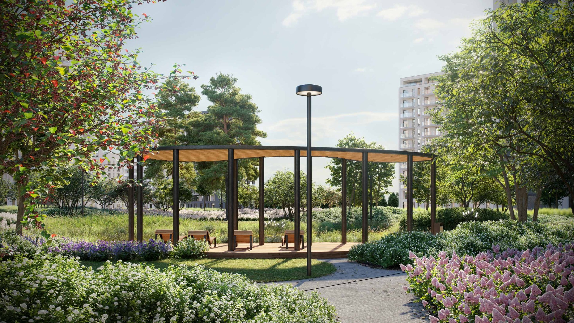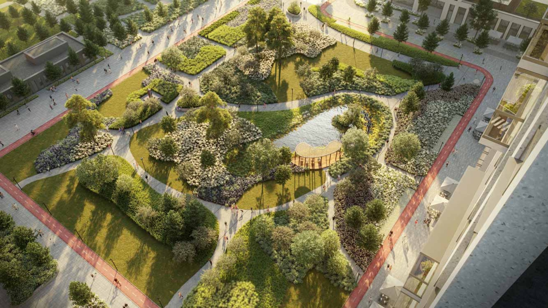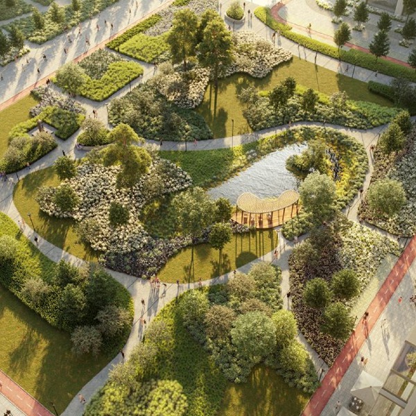 В рамках квартала появится новое зеленое пространство с точкой притяжения в роли искусственного водоема. Вокруг пруда будут расположены беседки и другие зоны рекреации.