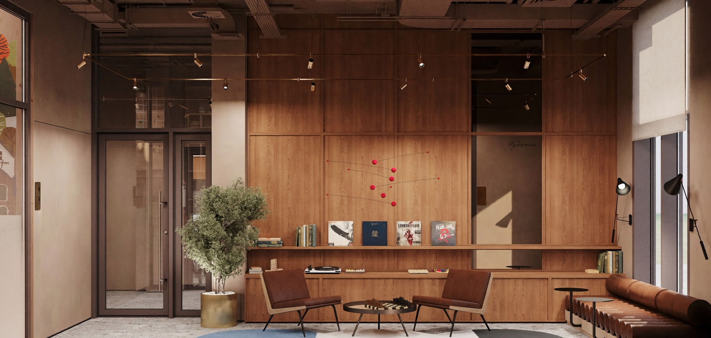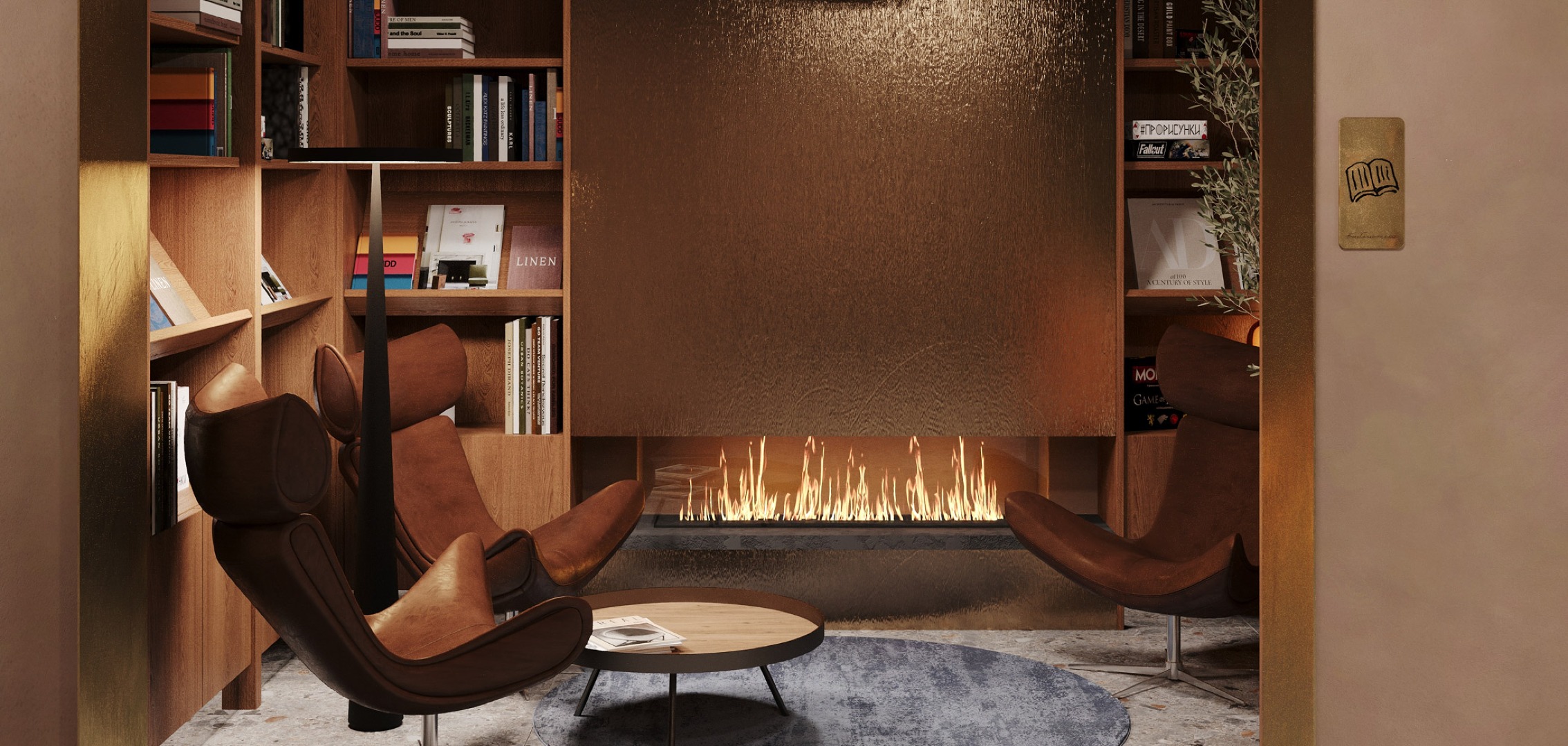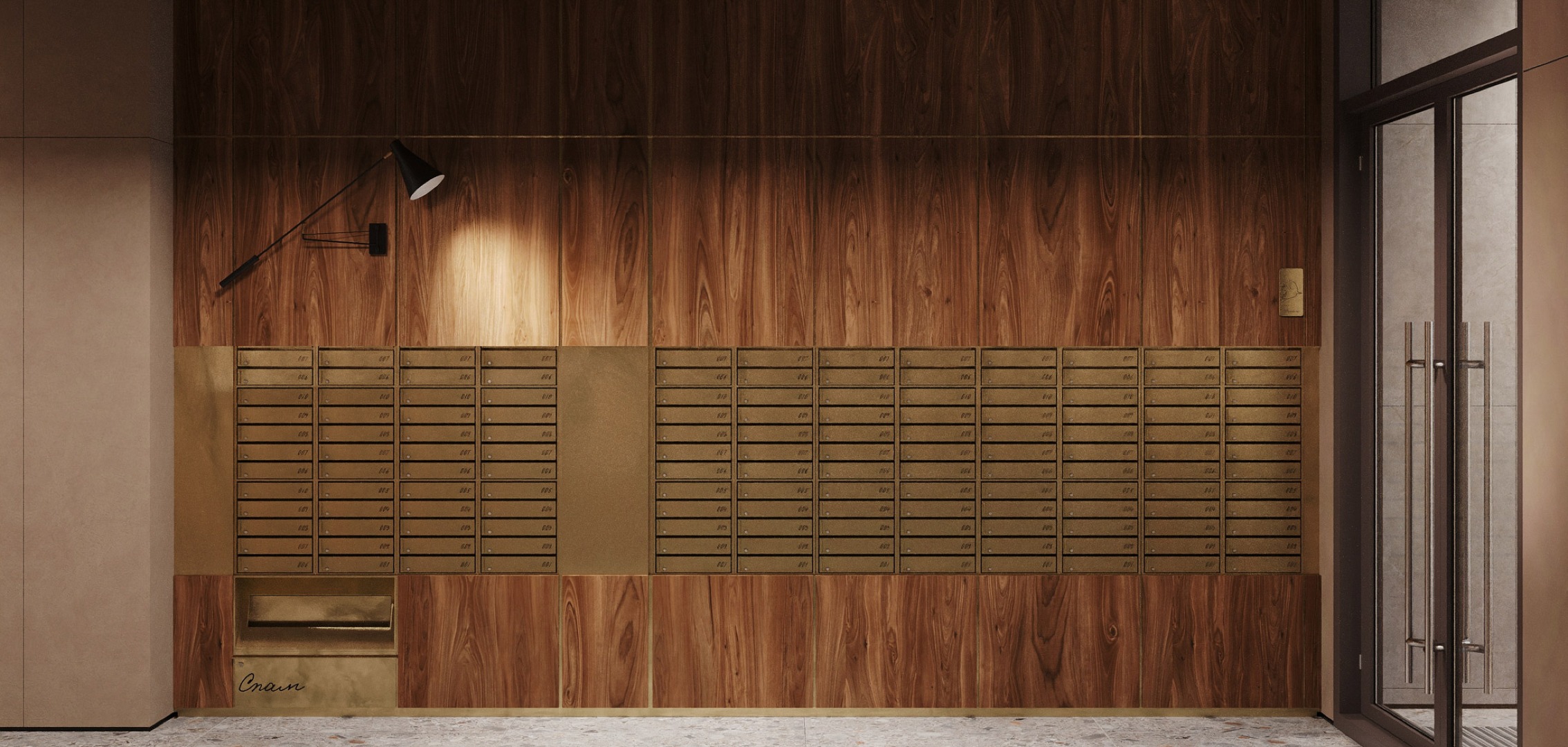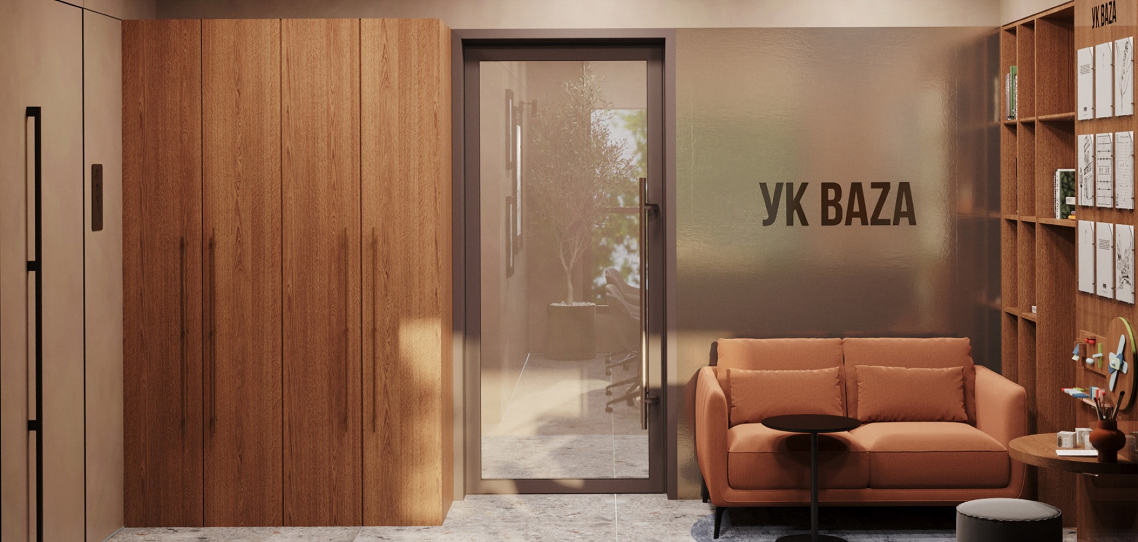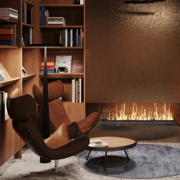 Привычный подъезд перерастает в самостоятельное и полноценное общественное пространство для жителей дома, пронизанное духом классической библиотеки. Зона буккроссинга, кожаная мебель, торшеры и журнальные столики задают атмосферу настоящего кабинета. Основными материалами интерьера выступают дерево и латунь, что придает помещению флер уюта и статуса.
