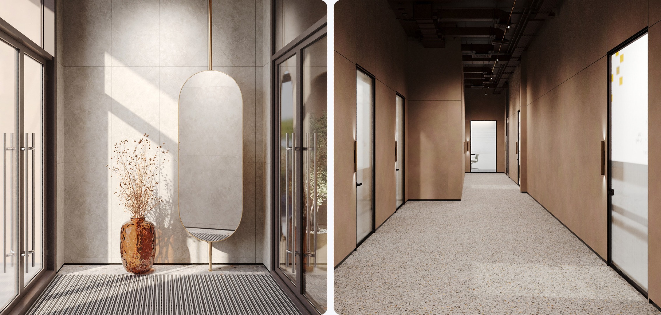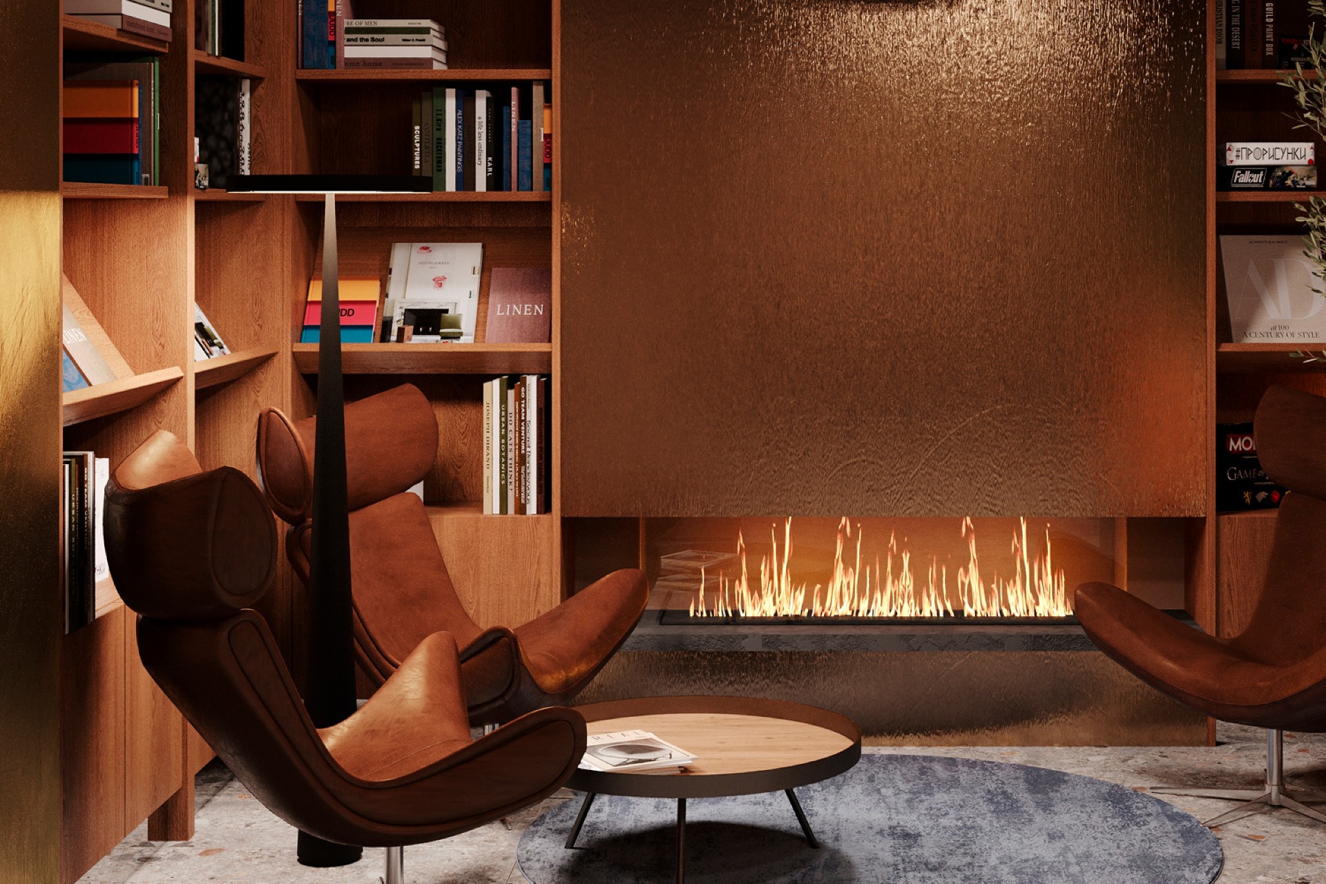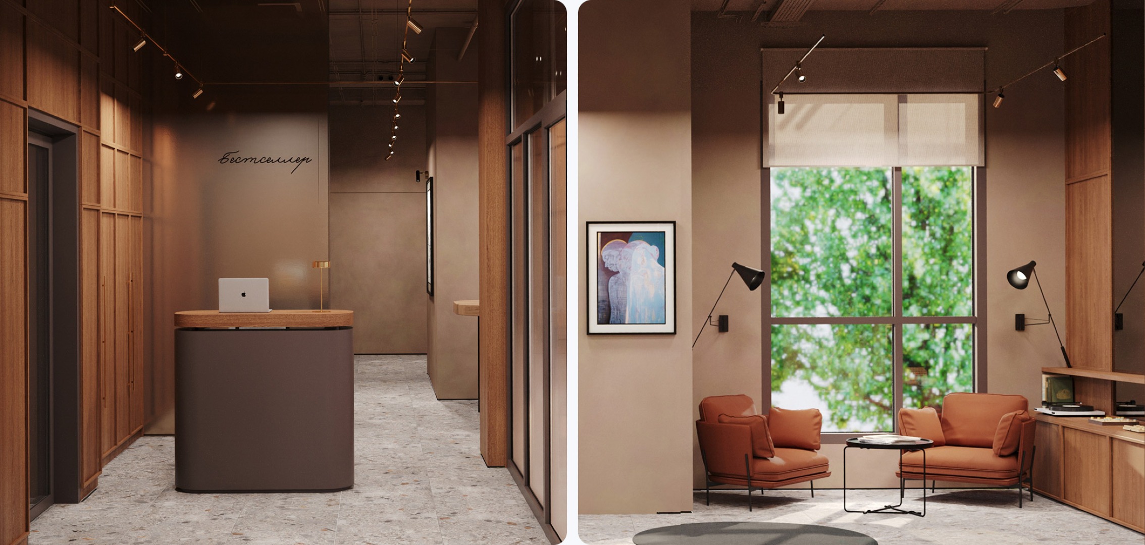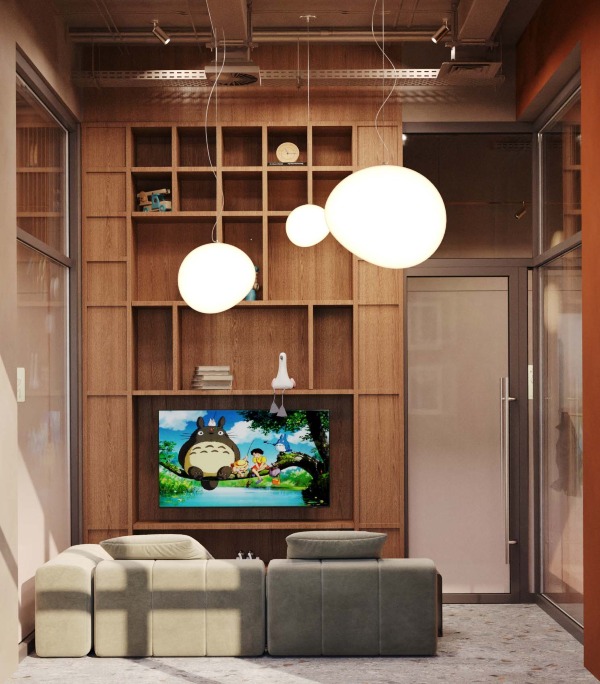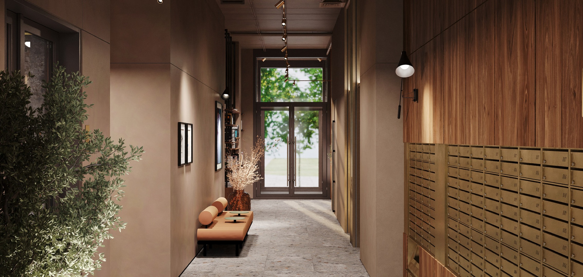 Привычный подъезд перерастает в самостоятельное и полноценное общественное пространство для жителей дома, пронизанное духом классической библиотеки. Зона буккроссинга, кожаная мебель, торшеры и журнальные столики задают атмосферу настоящего кабинета. Основными материалами интерьера выступают дерево и латунь, что придает помещению флер уюта и статуса.