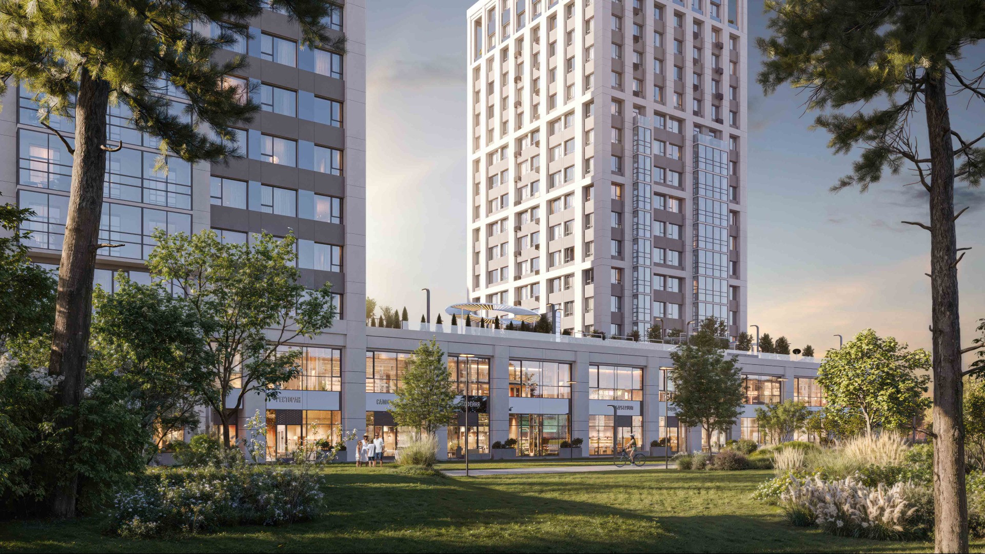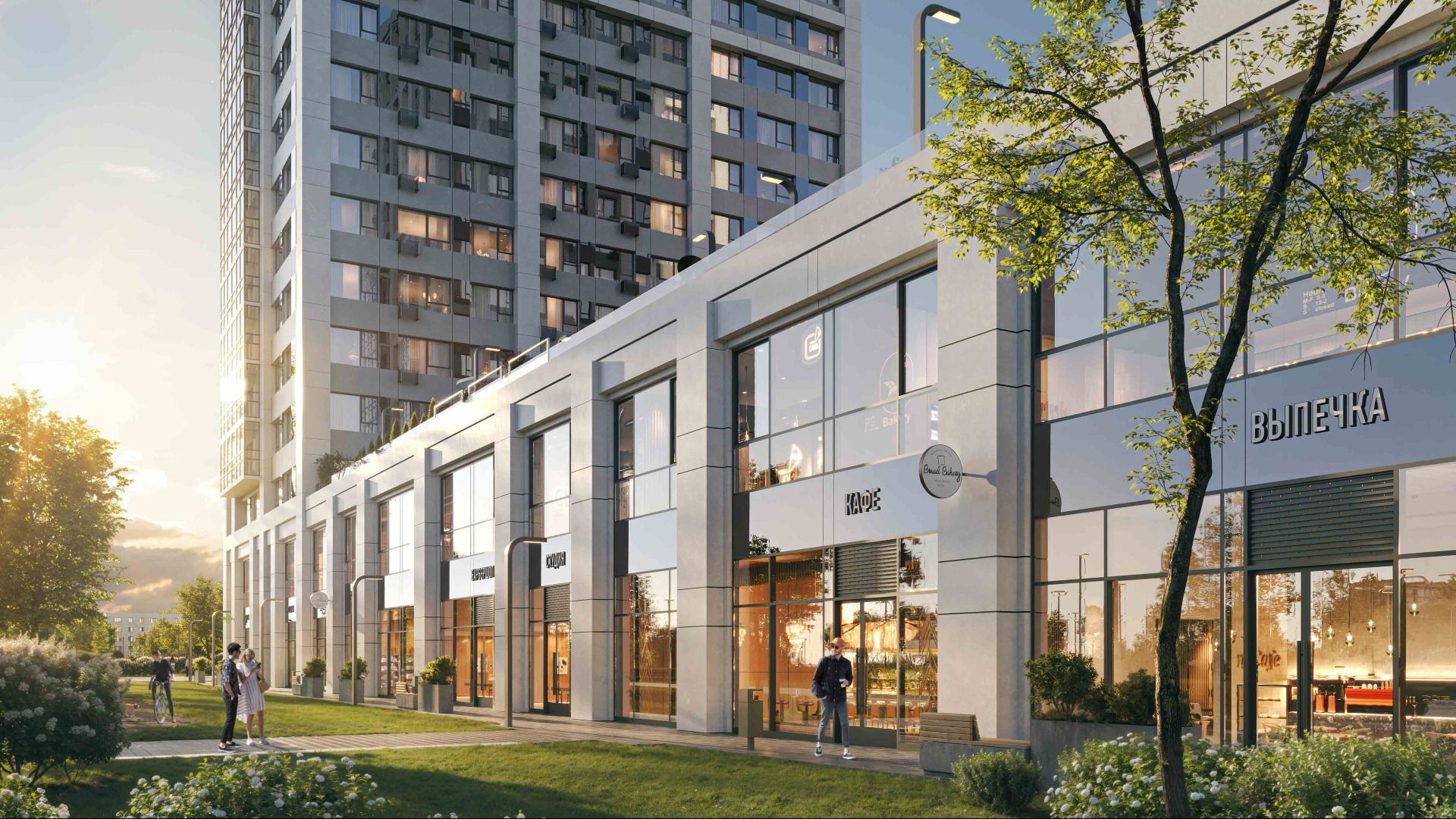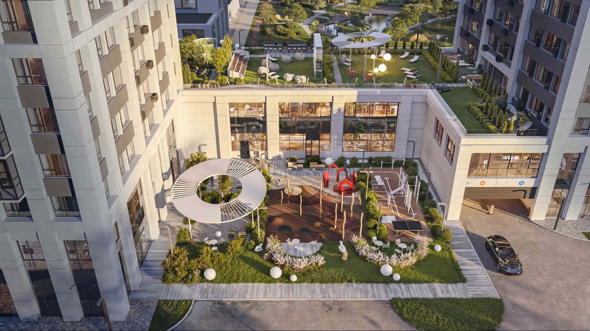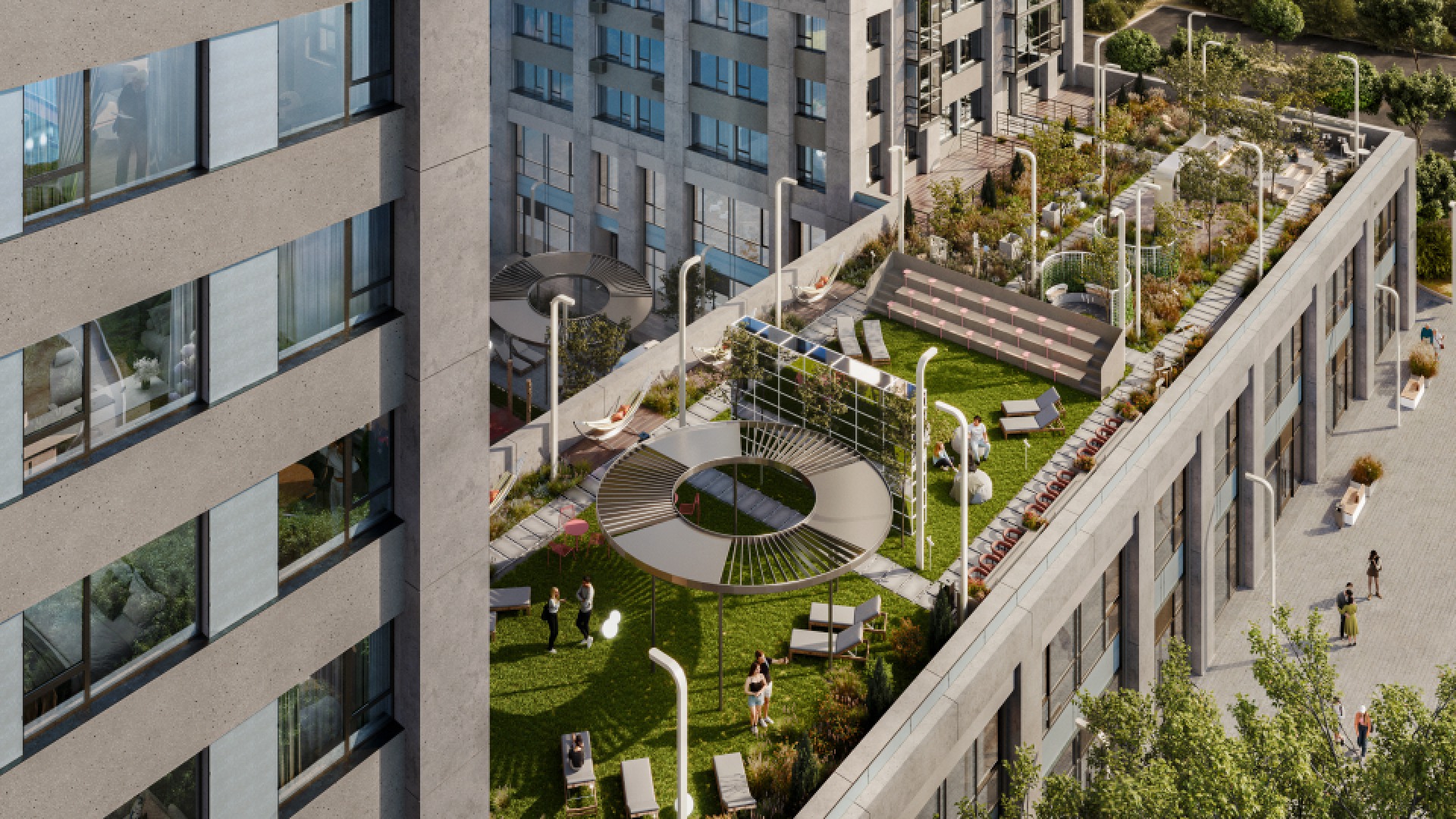 Двор «Бестселлера» разделен на 2 уровня и зонирован на тихую приватную зону стилобата и активную зону на уровне земли.