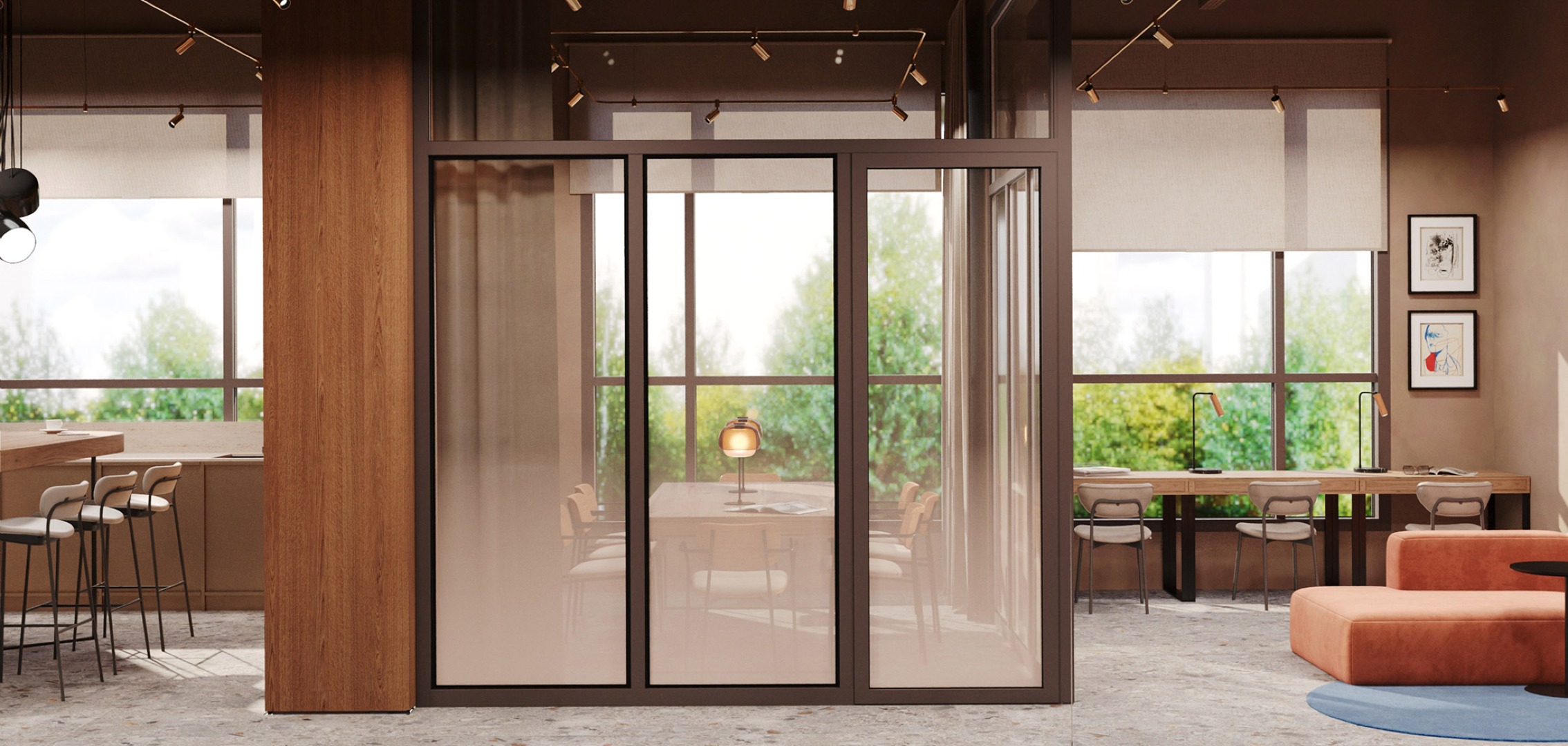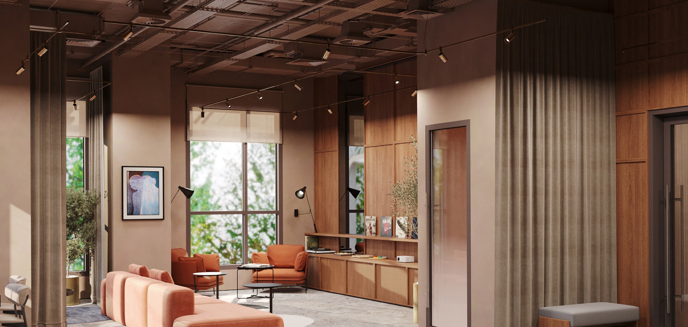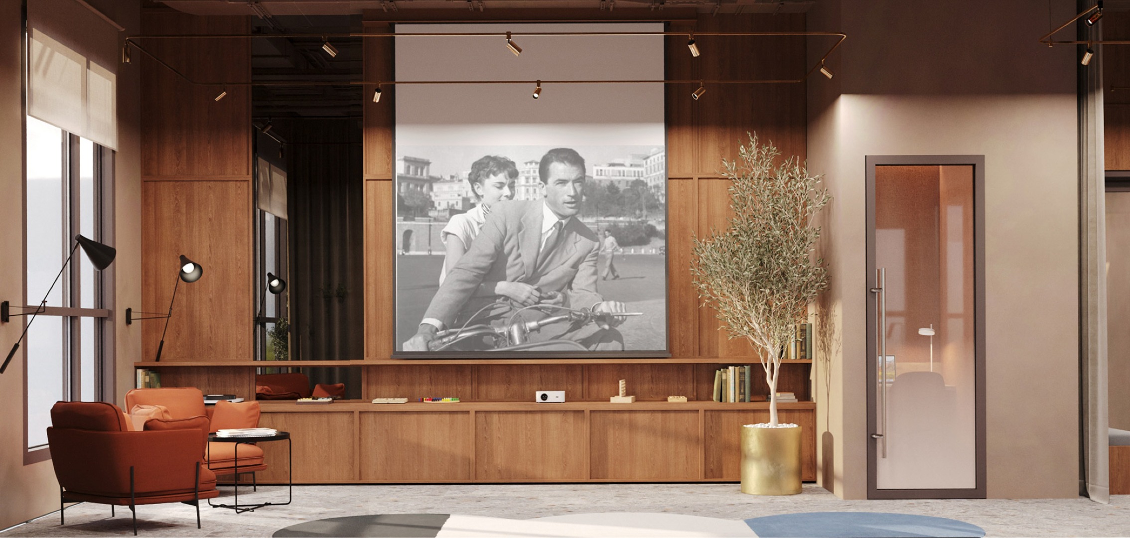 Зона лектория и проведения мастер-классов для мероприятий в ЖК, которую можно использовать как коворкинг. Также для вас будет доступна аренда помещения для проведения персонального мероприятия.