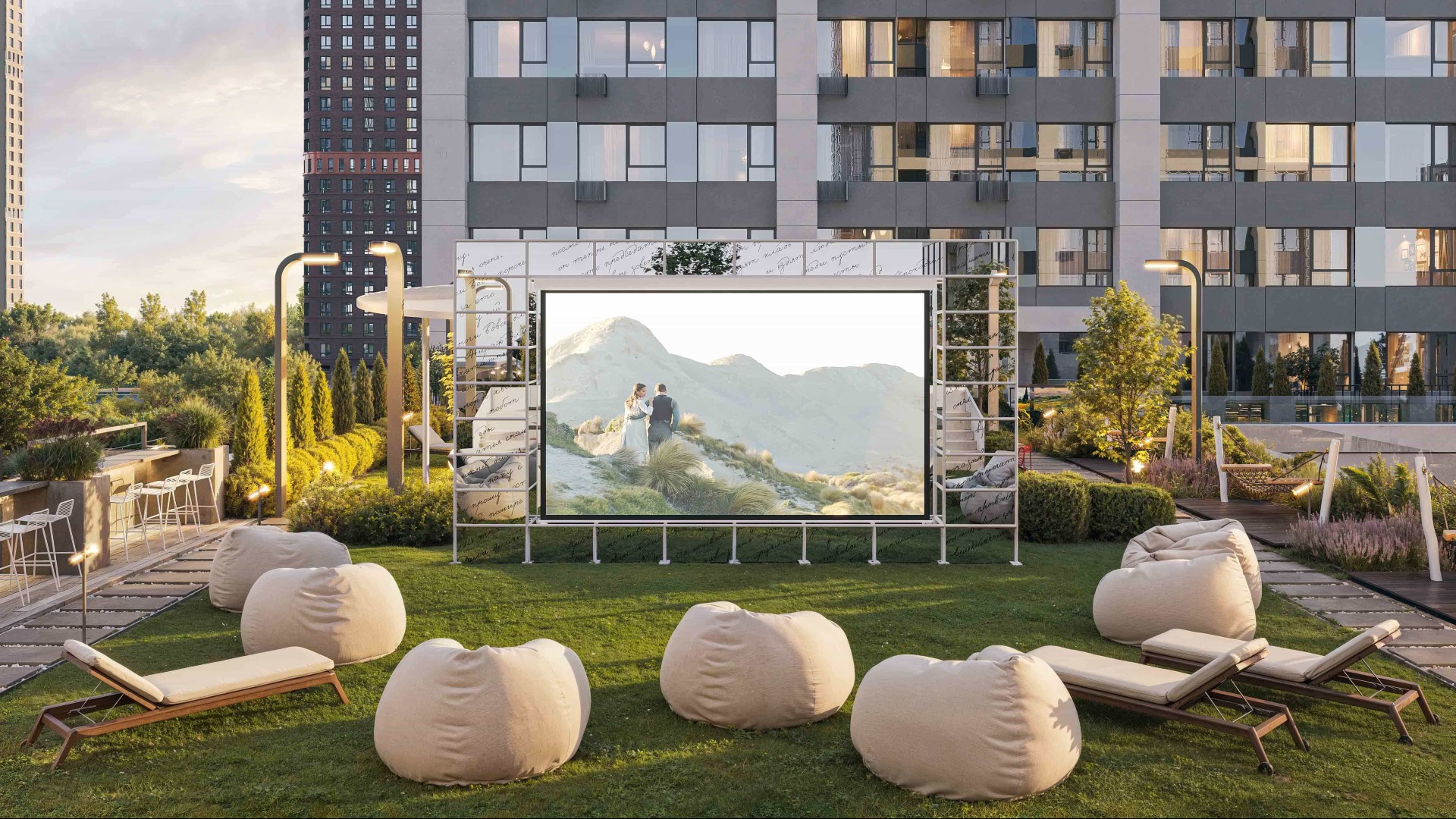 Спортивная зона с организованной на постоянной основе сетка спортивных мероприятий для жителей, таких как: йога, зумба, растяжка и др.